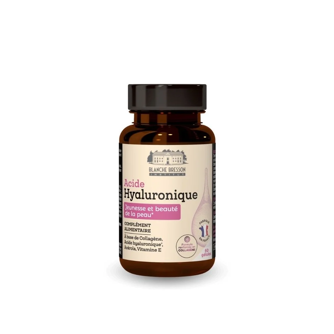 Hydrolysat de collagène de poissons (400 mg) ; enveloppe de la gélule : hydroxypropylméthylcellulose ; hyaluronate de sodium (158 mg dont 140 mg d'acide hyaluronique) ; poudre de jus de fruit d’acérola (132 mg) dont vitamine C naturelle (30 mg soit 37,5% des VNR*) ; antiagglomérant : stéarate de magnésium ; vitamine E (6 mg soit 50% des VNR*).