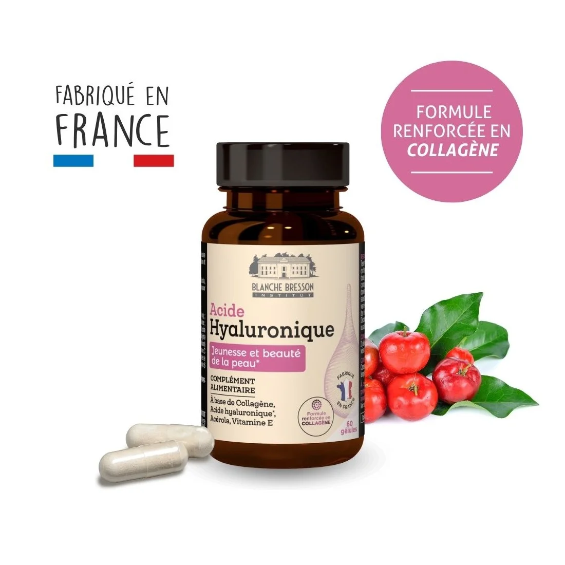Hydrolysat de collagène de poissons (400 mg) ; enveloppe de la gélule : hydroxypropylméthylcellulose ; hyaluronate de sodium (158 mg dont 140 mg d'acide hyaluronique) ; poudre de jus de fruit d’acérola (132 mg) dont vitamine C naturelle (30 mg soit 37,5% des VNR*) ; antiagglomérant : stéarate de magnésium ; vitamine E (6 mg soit 50% des VNR*).
