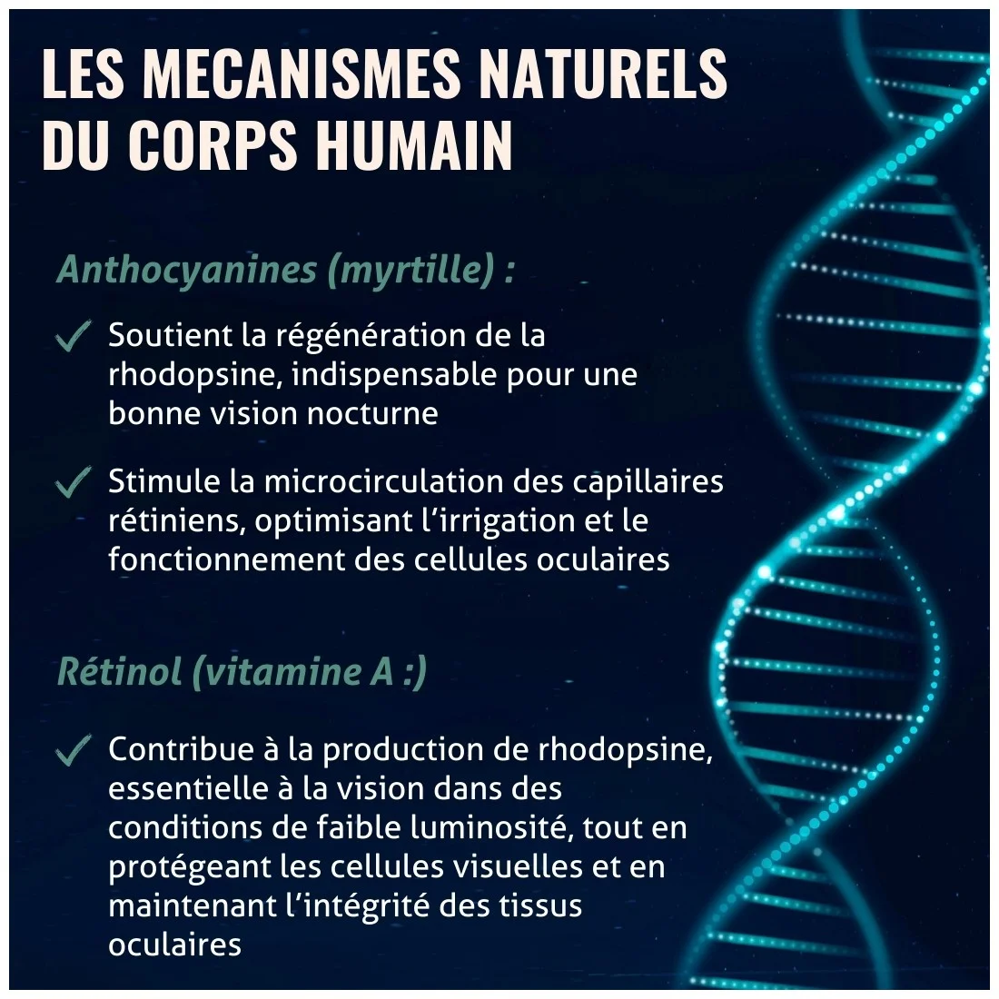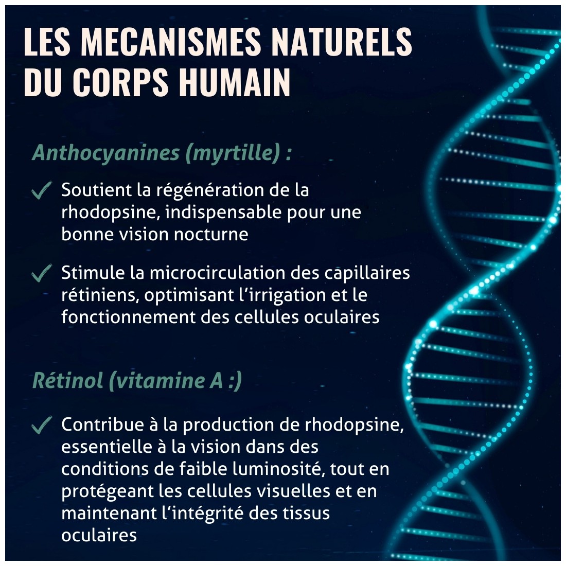 La myrtille est connue pour ses propriétés bénéfiques pour les yeux en raison de sa teneur en anthocyanes, des antioxydants qui soutiennent la santé rétinienne et la vision nocturne. Le rétinol (forme active de la vitamine A) et la riboflavine (vitamine B2) sont aussi essentiels pour maintenir une vision optimale et favoriser une meilleure adaptation à l'obscurité.