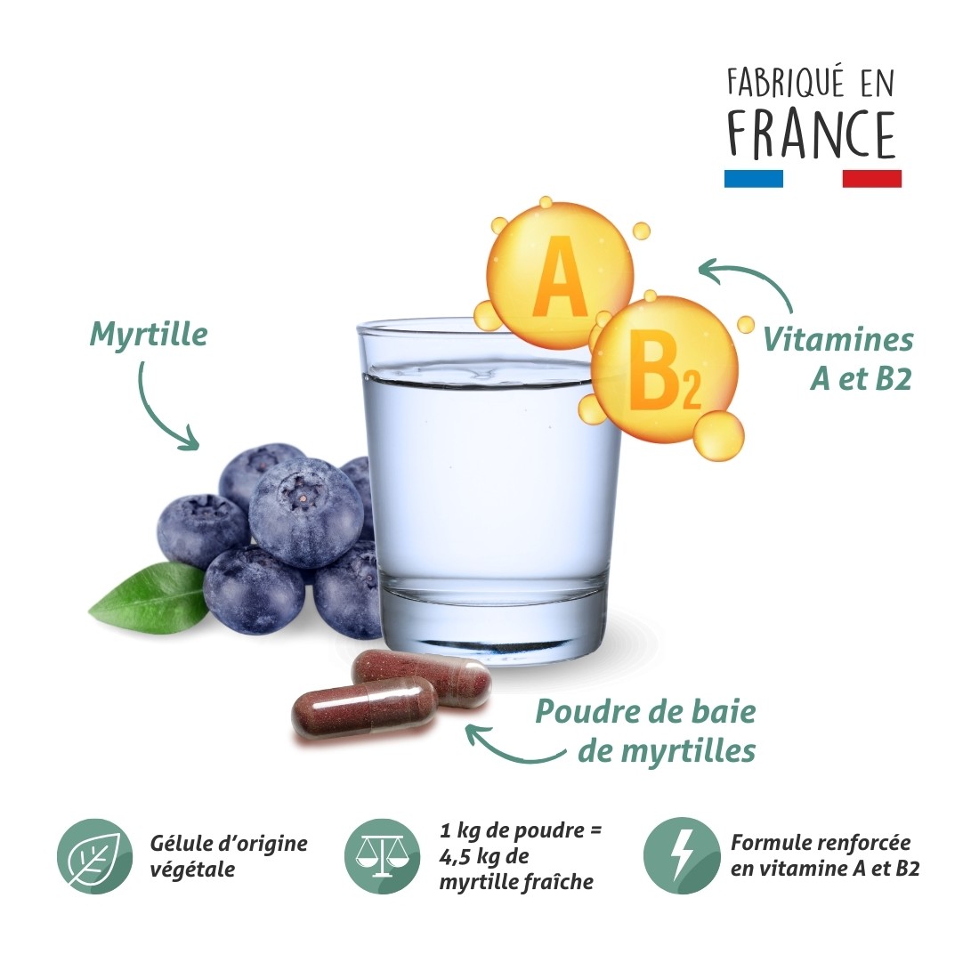 Poudre de baie de myrtille (540 mg) ; enveloppe de la gélule : hydroxypropylméthylcellulose ; antiagglomérants : talc, stéarate de magnésium ; vitamine A (400 µg soit 50% des VNR*) (agents d’enrobage : amidon de maïs, gomme d’acacia, maltodextrine) ; vitamine B2 (1.4 mg soit 100% des VNR*).