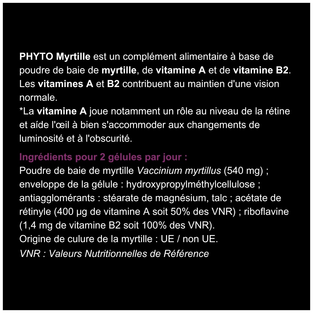 Phyto Myrtille, à base de poudre de myrtille sauvage, contient deux vitamines A et B2 qui contribuent au maintien d’une vision normale. La vitamine A est notamment importante pour l’adaptation de l’œil à l’obscurité et prévenir des éblouissements nocturnes.